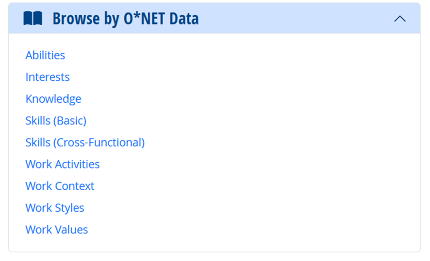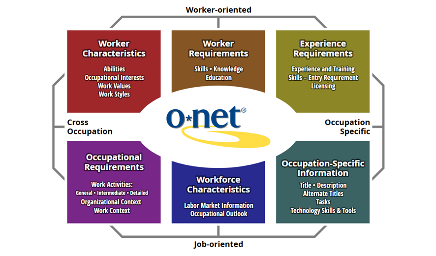 La base de datos O*NET contiene un amplio conjunto de variables que describen el trabajo y las características de los trabajadores, el marco general es que podéis ver en la imagen adjunta se conoce como el modelo de contenido. https://onetcenter.org/content.html